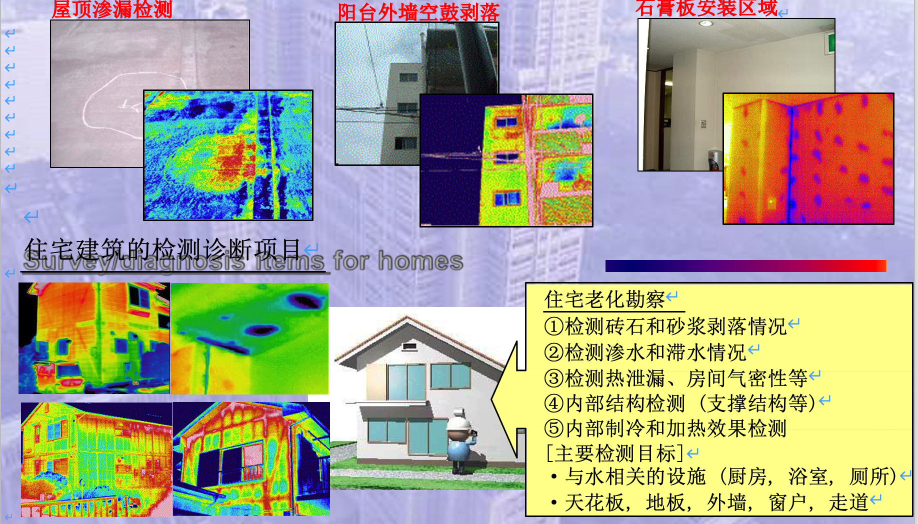 紅外檢測服務廣泛應用于樓宇建筑的評估、維護、檢測和診斷。紅外檢測服務是一種能將物體的溫度分布可視化的設備,通過對溫度的可視化,可在短時間內有效的進行“外墻飾面材料的剝落或空鼓檢測”、“滲漏水或滯水檢測”、“材料保溫性能檢測”、“房間氣密性檢測”、“電氣設備、管道和空調的檢測”等。此外,紅外檢測服務在樓宇建筑的“節能效果檢測”手段中*為高效有用。