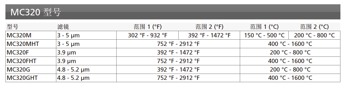 | 測溫范圍(多范圍可選): | 長波: -40°C-120°C; 0°C-500°C; 200°C-1600°C 中波: 150°C-500°C; 200°C-800°C; 400°C - 1600°C 穿透火焰:200°C-800°C; 400°C-1600°C 玻璃測溫: 200°C-800°C; 400°C-1600°C |