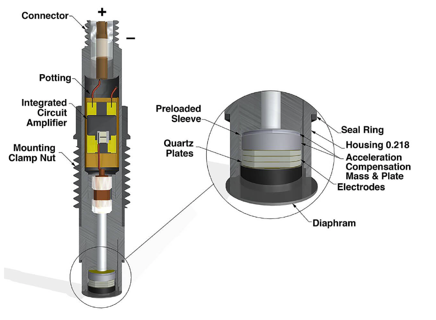 大多數(shù)PCB?壓電型壓力傳感器中的石英晶體在堅(jiān)固的傳感器外殼內(nèi)采用壓縮式預(yù)緊,電氣石晶體采用無(wú)約束形式。這些設(shè)計(jì)使傳感器具有微秒級(jí)響應(yīng)時(shí)間和幾百赫茲的固有頻率,能夠*小化過(guò)沖或者振鈴現(xiàn)象發(fā)生的可能性。